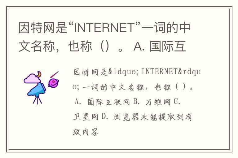 因特网是“INTERNET”一词的中文名称,也称()。 A. 国际互联网 B. 万维网 C. 卫星网 D. 浏览器