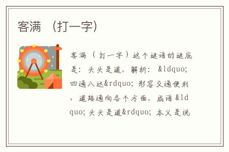解这个字谜的关键在于理解“客”转化为“人(亻)”,以及“满”的含义转化为“足”。这种通过意义关联来拆解汉字的方法,是字谜的常见技巧。