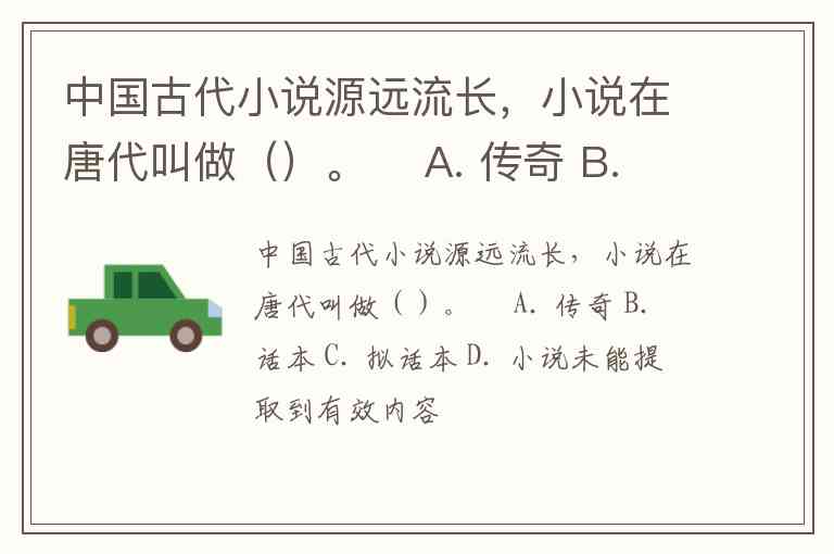 中国古代小说源远流长,小说在唐代叫做()。 A. 传奇 B. 话本 C. 拟话本 D. 小说