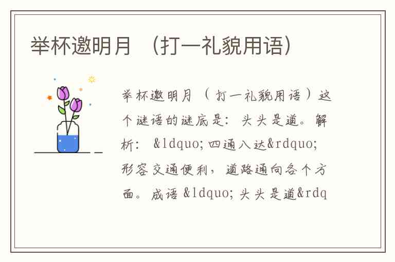 解读诗句:谜面“举杯邀明月”出自李白的《月下独酌》,描绘了诗人举起酒杯,邀请天上明月共饮的浪漫场景。