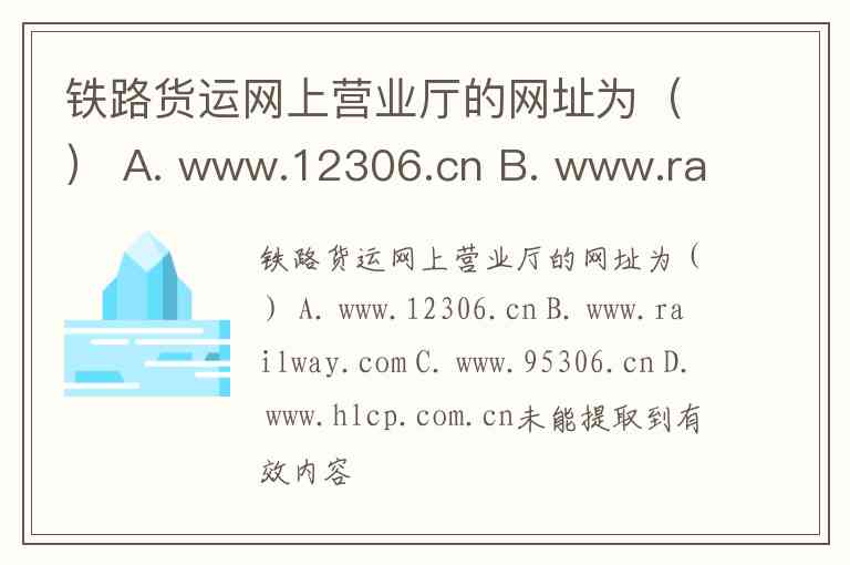 铁路货运网上营业厅的网址为() A. www.12306.cn B. www.railway.com C. www.95306.cn D. www.hlcp.com.cn