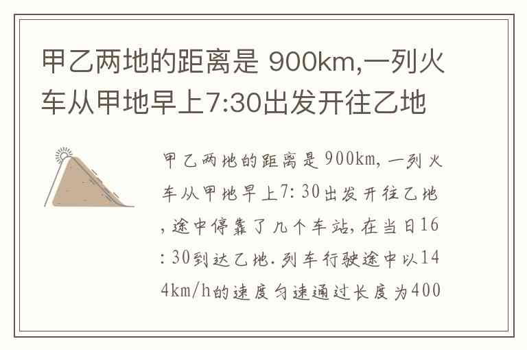 甲乙两地的距离是 900km,一列火车从甲地早上7:30出发开往乙地,途中停靠了几个车站,在当日16:30到达乙地.列车行驶途中以144km/h的速度匀速通过长度为400m的桥梁,列车全部通过桥梁的时间是25s.求: ( 1)火车从甲地开往乙地的平均速度是多少千米每小时? ( 2)火车的长度是多少米?