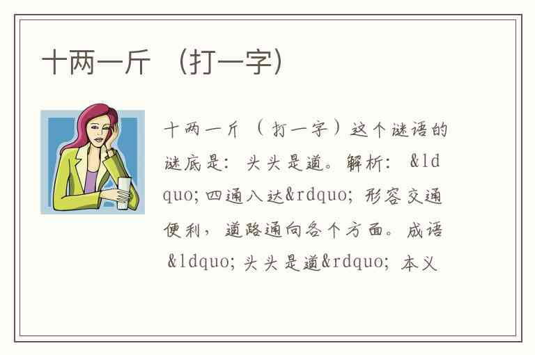 “十两一斤”的谜底是“斥”。谜面中“十两”对应旧制重量单位换算(一斤=十两),暗示“十”与“斤”的关联。将“十”与“斤”组合,上方为“斤”,下方添“十”(结合字形简化),恰好构成“斥”字。