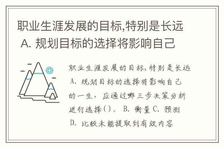 职业生涯发展的目标,特别是长远 A. 规划目标的选择将影响自己的一生,应通过哪三步决策分析进行选择( )。 B. 衡量 C. 预测 D. 比较