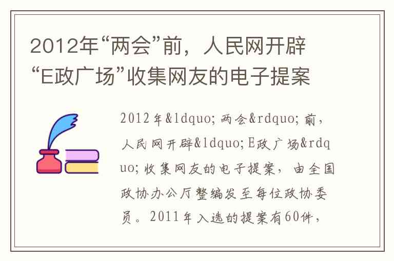 | ① 拓宽了政协调查研究的渠道 | 契合 | 传统上,政协委员通过视察、座谈等方式调研。人民网“E政广场”直接将网民提案整编后提供给委员,这无疑增加了一条汇集民智、了解社会关切的新渠道。 |
