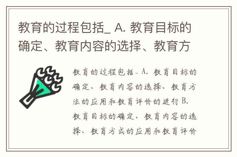 教育的过程包括_ A. 教育目标的确定、教育内容的选择、教育方法的应用和教育评价的进行 B. 教育目标的确定、教育内容的选择、教育方式的应用和教育评价的进行 C. 教育目标的确定、教育内容的实施、教育方法的应用和教育评价的进行 D. 教育目标的实施、教育内容的选择、教育方法的应用和教育评价的进行