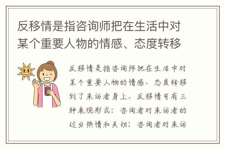 反移情的关键在于,咨询师将自己对生活中重要人物的情感转移到了来访者身上,并且这种转移影响了咨询师的情绪或行为,本质上是一种自我防御 。