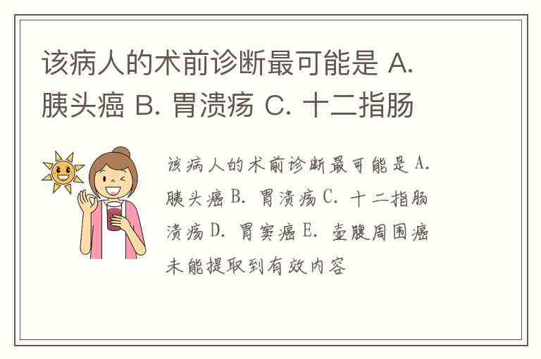 该病人的术前诊断最可能是 A. 胰头癌 B. 胃溃疡 C. 十二指肠溃疡 D. 胃窦癌 E. 壶腹周围癌