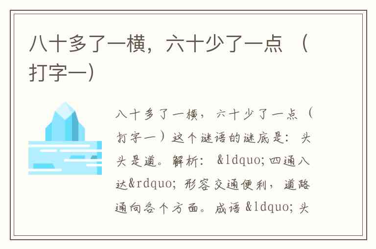 这个字谜的巧妙之处在于,它从两个不同的角度(“八十”的变形和“六十”的减笔)进行描述,最终都指向同一个“平”字,构思非常精妙。