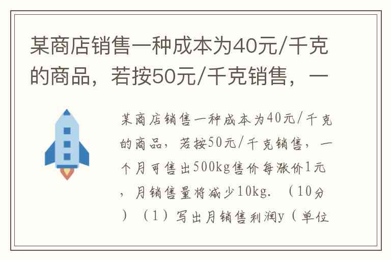 月销售量关系:根据题意,售价在50元的基础上每涨价1元,月销售量就减少10kg。因此,月销售量可以表示为:500−10(x−50)。这个式子可以简化为: