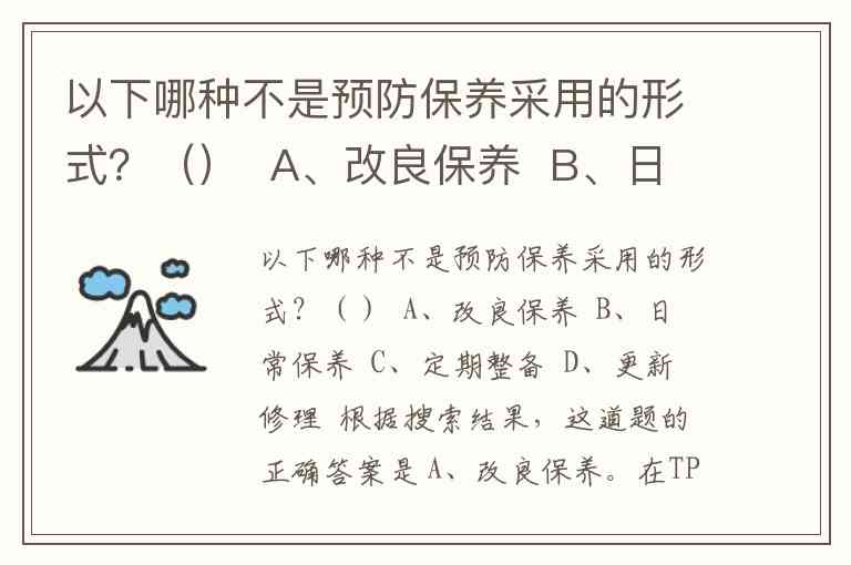 而 改良保养(或称为“保全改善”)虽然也是设备管理中的重要活动,但它不属于预防保养的范畴。其主要目的是通过改进设备的设计或材质,从根本上消除故障源或延长零件寿命,属于一种主动的、改善性的维护策略,而非旨在维持设备现状的预防性措施。