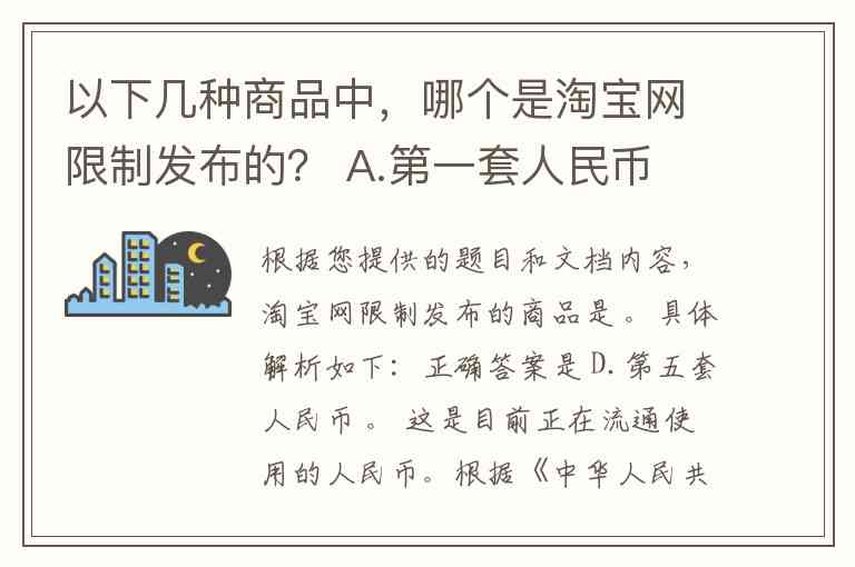 正确答案是 D.第五套人民币 。 这是目前正在流通使用的人民币。根据《中华人民共和国人民币管理条例》的规定,禁止非法买卖流通人民币。因此,作为电商平台,淘宝网会限制或禁止发布正在流通中的人民币及相关商品 。