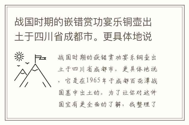 战国时期的嵌错赏功宴乐铜壶出土于四川省成都市。更具体地说,它是在1965年于成都百花潭战国墓中出土的。