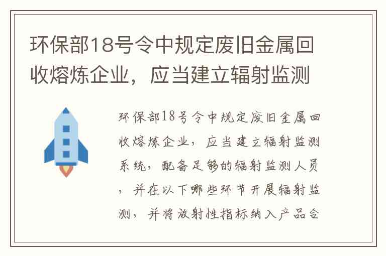 根据环保部18号令的规定,废旧金属回收熔炼企业需要在以下环节开展辐射监测,并将放射性指标纳入产品合格指标中: