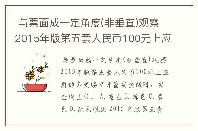 与票面成一定角度(非垂直)观察2015年版第五套人民币100元上应用的光变镂空开窗安全线时,安全线呈()。 A.蓝色 B.绿色 C.黄色 D.红色