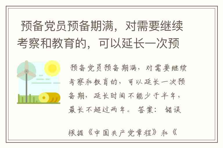 预备党员预备期满,对需要继续考察和教育的,可以延长一次预备期,延长时间不能少于半年,最长不超过两年。 答案: 错误根据《中国共产党章程》和《中国共产党发展党员工作细则》的规定: