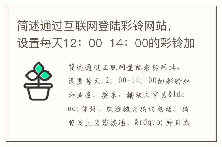 登录 sD.12530.com → 输入手机号和密码 → 进入“彩铃加加” → 输入播放文字“你好!欢迎拨打我的电话。我将马上为您接通。” → 添加音效“小孩欢笑” → 设置时间段 12:00–14:00 → 保存。