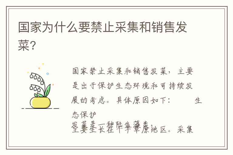 国家禁止采集和销售发菜,主要是出于保护生态环境和可持续发展的考虑。具体原因如下: