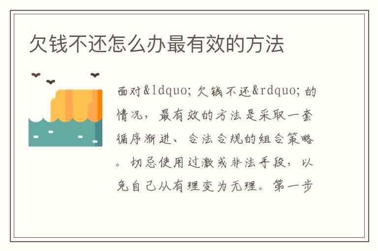 面对“欠钱不还”的情况,最有效的方法是采取一套循序渐进、合法合规的组合策略。切忌使用过激或非法手段,以免自己从有理变为无理。