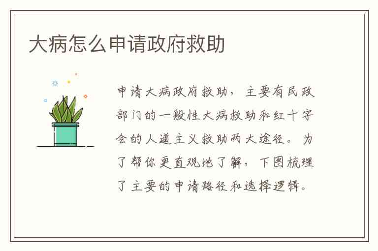 申请大病政府救助,主要有民政部门的一般性大病救助和红十字会的人道主义救助两大途径。为了帮你更直观地了解,下图梳理了主要的申请路径和选择逻辑。