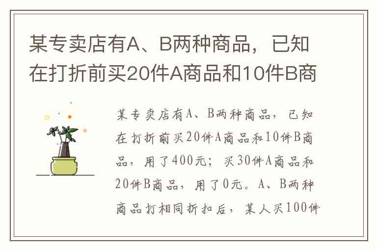 某专卖店有A、B两种商品,已知在打折前买20件A商品和10件B商品,用了400元;买30件A商品和20件B商品,用了0元。A、B两种商品打相同折扣后,某人买100件A商品和200件B商品,一共比不打折少花了0元,那么A、B两种打了多少折扣? A. 6折 B. 7折 C. 7.5折 D. 8折