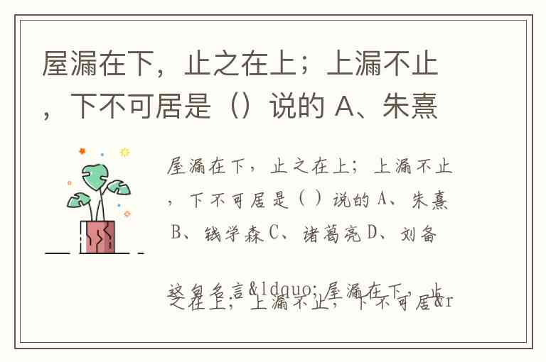屋漏在下,止之在上;上漏不止,下不可居是()说的 A、朱熹 B、钱学森 C、诸葛亮 D、刘备这句名言“屋漏在下,止之在上;上漏不止,下不可居”是 C. 诸葛亮 说的。