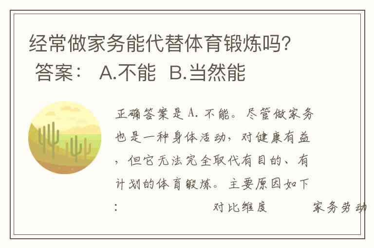 尽管做家务也是一种身体活动,对健康有益,但它无法完全取代有目的、有计划的体育锻炼。主要原因如下: