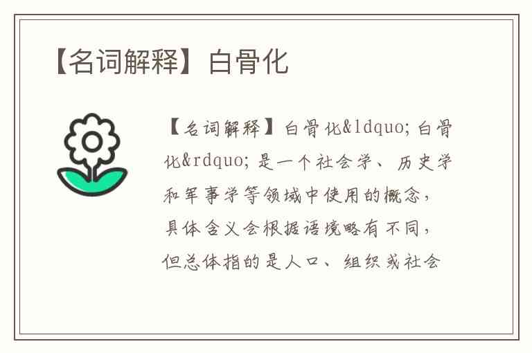 “白骨化”是一个社会学、历史学和军事学等领域中使用的概念,具体含义会根据语境略有不同,但总体指的是人口、组织或社会结构由于长期消耗、战争、疾病、迁徙等原因而严重衰减,最终呈现“枯竭”或“空壳化”的状态。