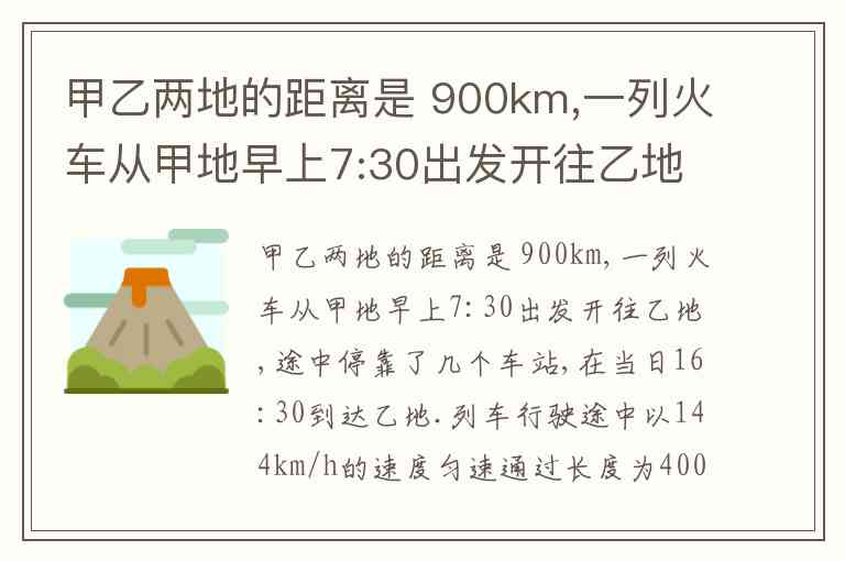 甲乙两地的距离是 900km,一列火车从甲地早上7:30出发开往乙地,途中停靠了几个车站,在当日16:30到达乙地.列车行驶途中以144km/h的速度匀速通过长度为400m的桥梁,列车全部通过桥梁的时间是25s.求: ( 1)火车从甲地开往乙地的平均速度是多少千米每小时? ( 2)火车的长度是多少米?