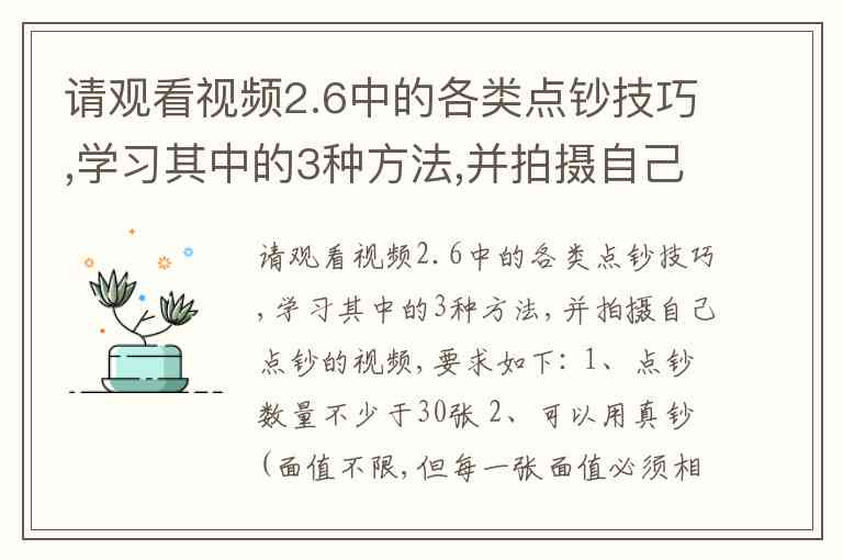 请观看视频2.6中的各类点钞技巧,学习其中的3种方法,并拍摄自己点钞的视频,要求如下: 1、点钞数量不少于30张 2、可以用真钞(面值不限,但每一张面值必须相同),也可用纸张裁剪成真钞的大小代替真钞 3、视频总长度不少于2分钟,点钞方法不少于3种,采取每种方法之前需进行说明是哪种点钞方法 4、视频中必须有本人出镜,不允许找人代替或只出现手部镜头。 5、3月22号24:00点之前完成