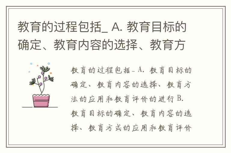 教育的过程包括_ A. 教育目标的确定、教育内容的选择、教育方法的应用和教育评价的进行 B. 教育目标的确定、教育内容的选择、教育方式的应用和教育评价的进行 C. 教育目标的确定、教育内容的实施、教育方法的应用和教育评价的进行 D. 教育目标的实施、教育内容的选择、教育方法的应用和教育评价的进行