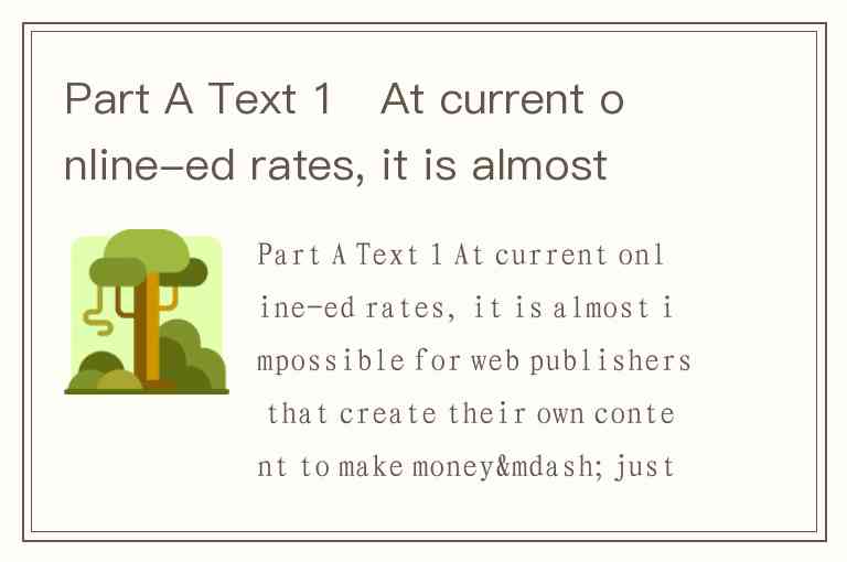 Part A Text 1 At current online-ed rates, it is almost impossible for web publishers that create their own content to make money—just ask any of the two dozen, from Z.com to eCountries that have gone bust in the past month alone. The mason for the bloodbath is : advertisers are not willing m pay enough for web ads to support the cost of displaying them. To see why, consider a credit-card firm that wants to find customers online. Say it runs a campaign to display its banner ad to 2 million viewers. Using industry averages, one out of every 200 viewers can be expected to click on the ad: one out of every 100 of those will actually sign up for a credit card. Thus, the campaign would yield 100 new customers. Offline. the firm pays about $150 for each customer it acquires, through anything from direct mail to television ads. Using the same rate, it would therefore be willing to pay $15.000 for those 2 million online-ad views, or a cost-per-thousand- views (CPM) rate of $7.50. Now consider the economics of the website that is running those ads. It probably does not have its own ad sales team, so it is getting those credit-card ads from an advertising network such as DoubleClick. The network takes half the revenues, leaving the site with a CPM of $3.75. Imagine that the site is very successful, say among the top few hundred on the web. If so, it may be able to generate 10m page views ’a month. At $3.75 per thousand views, that means revenue of $37,500 a month. Take out hardware, software and bandwidth costs, and enough might be left to support two employees or so. This grim picture can be improved by selling more than one ad per page. but such clutter often comes at the cost of a lower rate of "click-throughs" and, ually, even lower CPMs. The site can try to charge higher CPMs by providing more information about viewer demographics, to help advertisers target their ads, or by claiming that it has a sign that may justify a fee for brand-building advertisers. But advertisers are skeptical. The biggest web portals get their content almost for free—a mixture of material from other-sites and content created by viewers—and attract so much traffic that they can support huge organizations on low CPMs. But for most smaller websites, there is no way out. Those that cannot find revenue sources beyond advertising will either go bust or be forced to admit that their site is a non-profit enterprise. If truth-in-advertising rules were enforced, most dotcoms would be dotorgs. The author’s attitude to the future of websites is______. A. distrustful B. pessimistic C. detesting D. optimistic