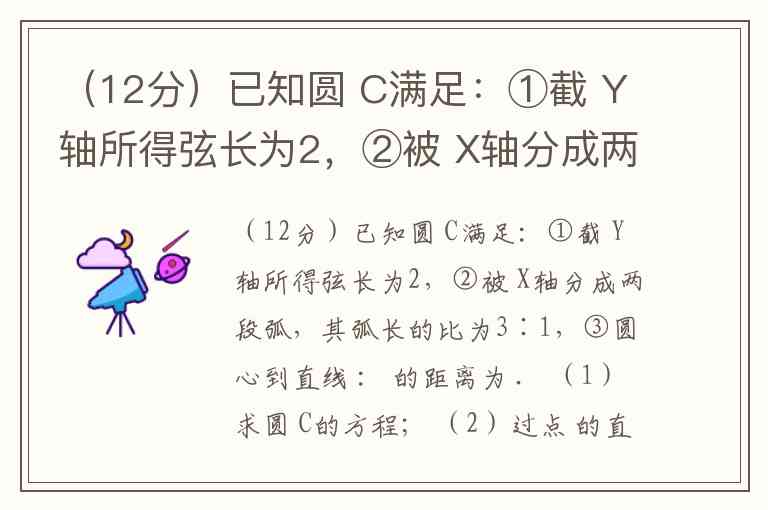 (12分)已知圆 C满足:①截 Y轴所得弦长为2,②被 X轴分成两段弧,其弧长的比为3∶1,③圆心到直线 : 的距离为 . (1)求圆 C的方程; (2)过点 的直线能否与圆 C相切,若相切,求切线方程,若不相切,说明理由.