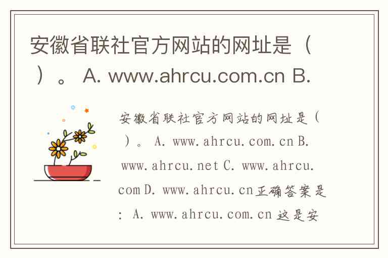 安徽省联社官方网站的网址是( )。 A. www.ahrcu.com.cn B. www.ahrcu.net C. www.ahrcu.com D. www.ahrcu.cn