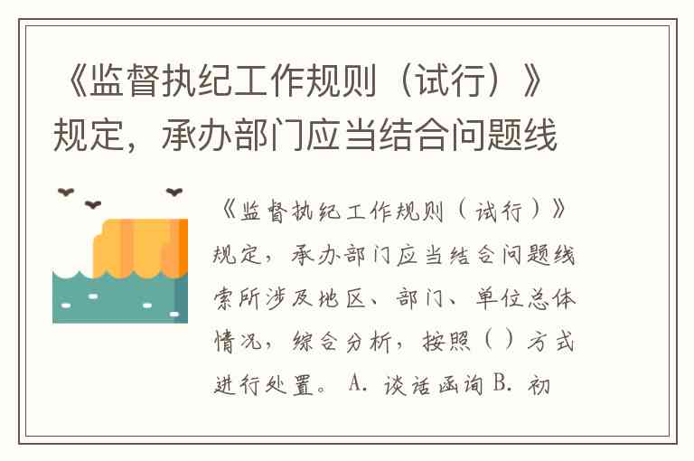 根据《监督执纪工作规则(试行)》的规定,承办部门在接到问题线索后,应当结合问题线索所涉及地区、部门、单位总体情况,综合分析,按照“初步核实”方式进行处置。