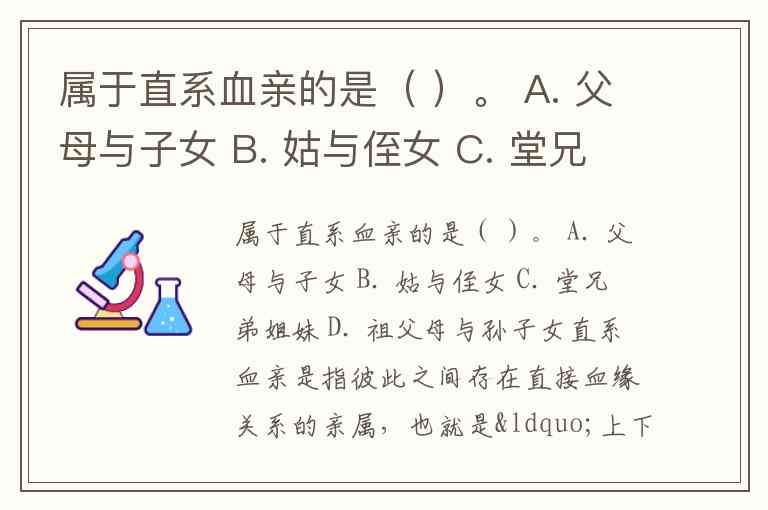 属于直系血亲的是( )。 A. 父母与子女 B. 姑与侄女 C. 堂兄弟姐妹 D. 祖父母与孙子女