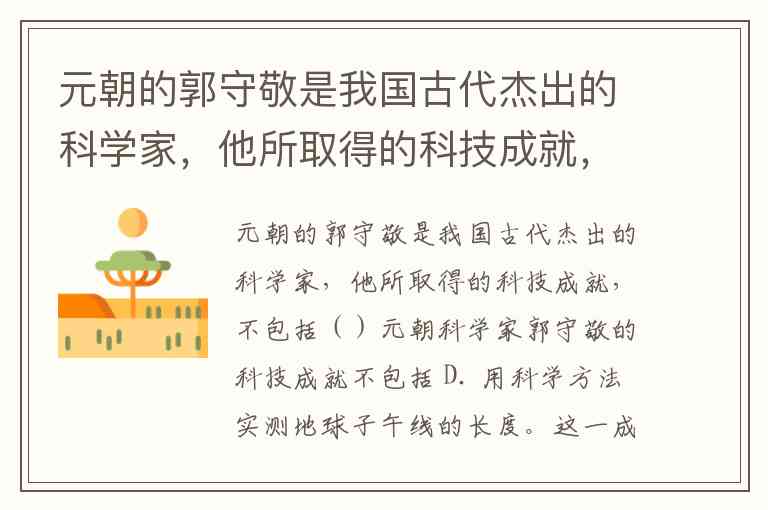 元朝科学家郭守敬的科技成就不包括 D. 用科学方法实测地球子午线的长度。这一成就实际上由唐代僧一行(张遂)在开元十二年(724年)主持完成,他通过在河南、北至漠北、南达交州的13个点测量,推算出子午线一度的弧长约合123.7公里,是世界上首次大规模子午线实测。
