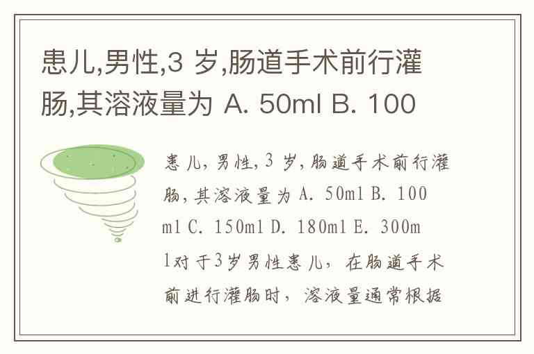 患儿,男性,3 岁,肠道手术前行灌肠,其溶液量为 A. 50ml B. 100ml C. 150ml D. 180ml E. 300ml