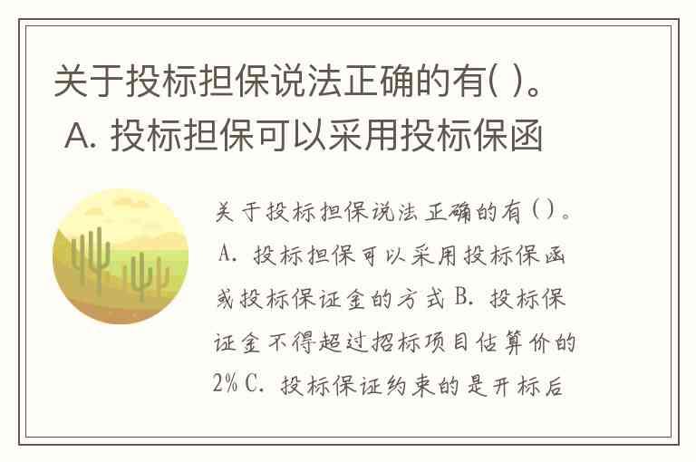 关于投标担保说法正确的有( )。 A. 投标担保可以采用投标保函或投标保证金的方式 B. 投标保证金不得超过招标项目估算价的2% C. 投标保证约束的是开标后投标人的行为 D. 投标保证约束的是递交投标文件后投标人的行为 E. 投标保证金有效期应当与投标有效期一致