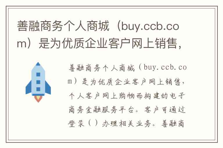善融商务个人商城(buy.ccb.com)是为优质企业客户网上销售,个人客户网上购物而构建的电子商务金融服务平台。客户可通过登录()办理相关业务。