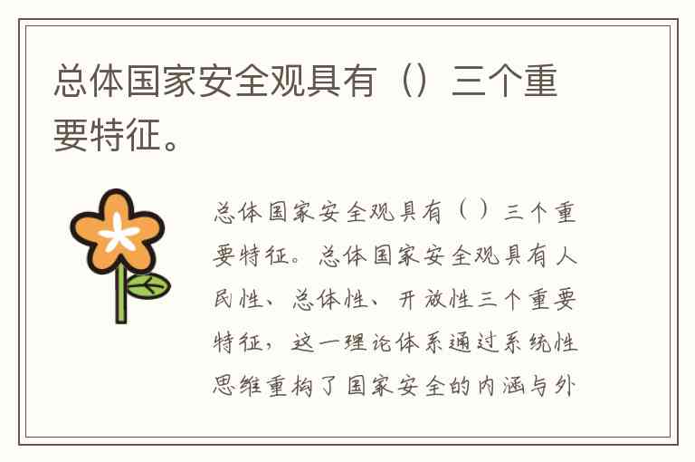 总体国家安全观具有人民性、总体性、开放性三个重要特征,这一理论体系通过系统性思维重构了国家安全的内涵与外延,既立足中国实践,又回应全球安全治理挑战。