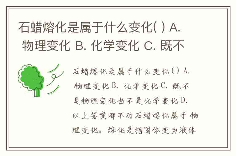 石蜡熔化是属于什么变化( ) A. 物理变化 B. 化学变化 C. 既不是物理变化也不是化学变化 D. 以上答案都不对