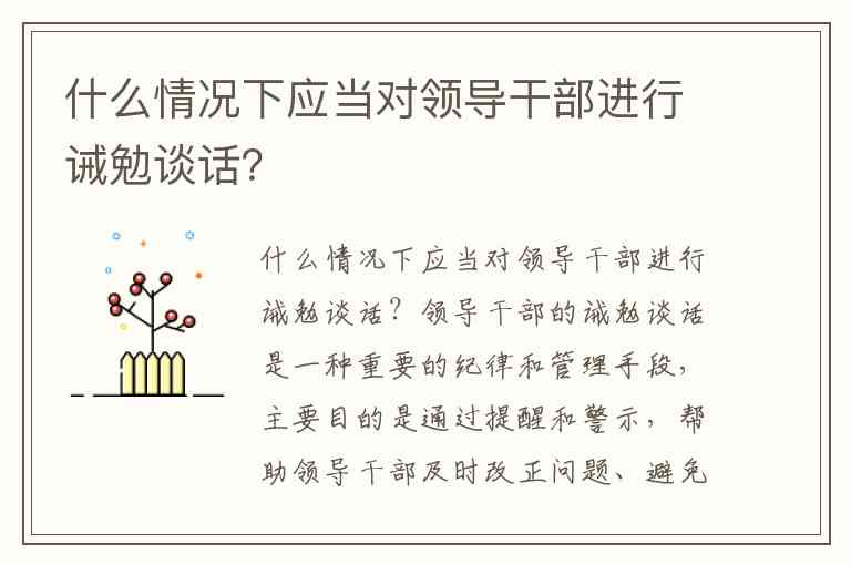 领导干部的诫勉谈话是一种重要的纪律和管理手段,主要目的是通过提醒和警示,帮助领导干部及时改正问题、避免更严重的错误发生,确保党和国家的政策、法规的有效执行。一般情况下,领导干部应当进行诫勉谈话的情形主要有以下几种: