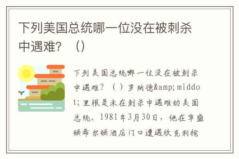 罗纳德·里根是未在刺杀中遇难的美国总统。1981年3月30日,他在华盛顿希尔顿酒店门口遭遇欣克利枪击,子弹击中肺部造成 pneumothorax(气胸),经抢救后康复并完整任满两届任期。这一事件成为美国特勤局强化总统安保措施的重要转折点。