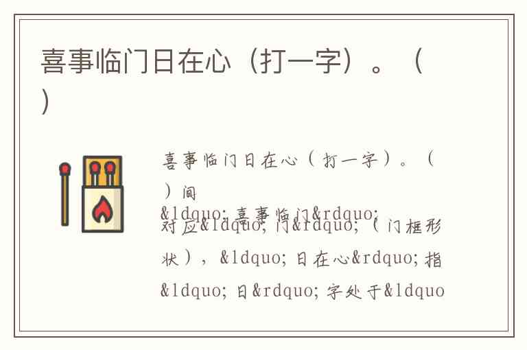 “喜事临门”对应“门”(门框形状),“日在心”指“日”字处于“门”的中间位置,组合成“间”字。这个字谜通过方位暗示与汉字结构拆解,将“喜事”的吉祥意象与字形巧妙结合,体现汉字表意的趣味性。