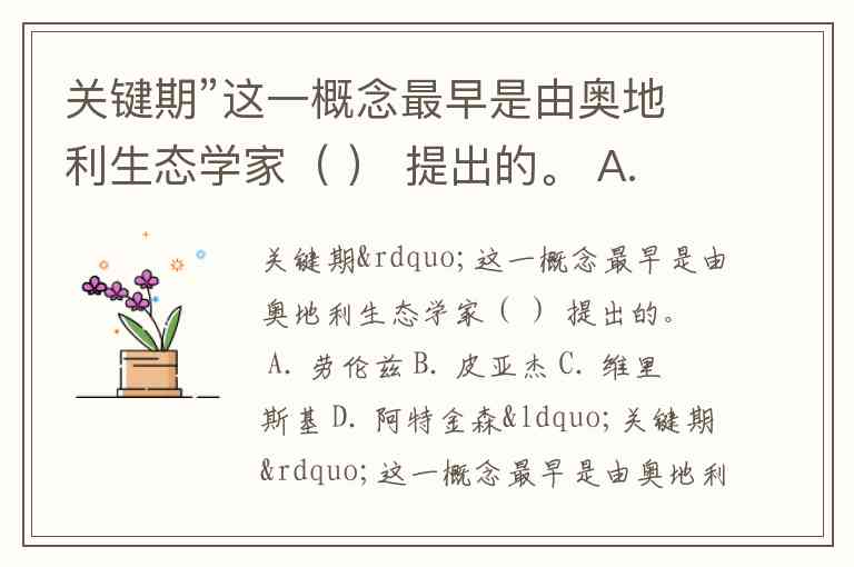 关键期”这一概念最早是由奥地利生态学家( ) 提出的。 A. 劳伦兹 B. 皮亚杰 C. 维里斯基 D. 阿特金森