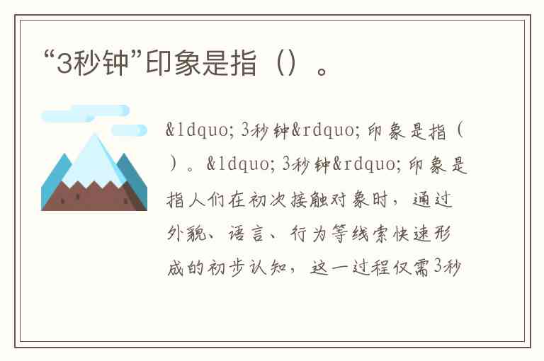 “3秒钟”印象是指人们在初次接触对象时,通过外貌、语言、行为等线索快速形成的初步认知,这一过程仅需3秒左右,却直接影响后续互动的走向。它源于心理学中的“首因效应”,是人类进化中发展出的快速判断机制,广泛作用于社交、职场、商业等场景。