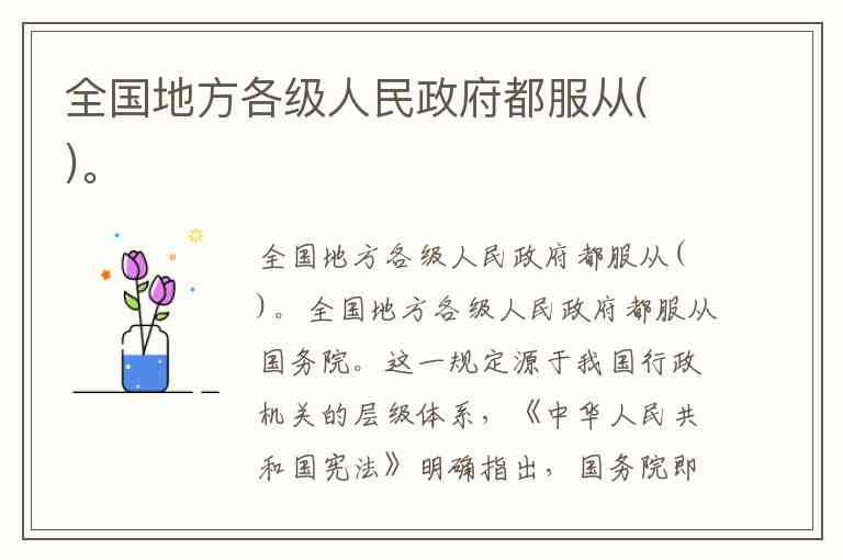全国地方各级人民政府都服从国务院。这一规定源于我国行政机关的层级体系,《中华人民共和国宪法》明确指出,国务院即中央人民政府,是最高国家行政机关,而“全国地方各级人民政府都是国务院统一领导下的国家行政机关,都服从国务院”。