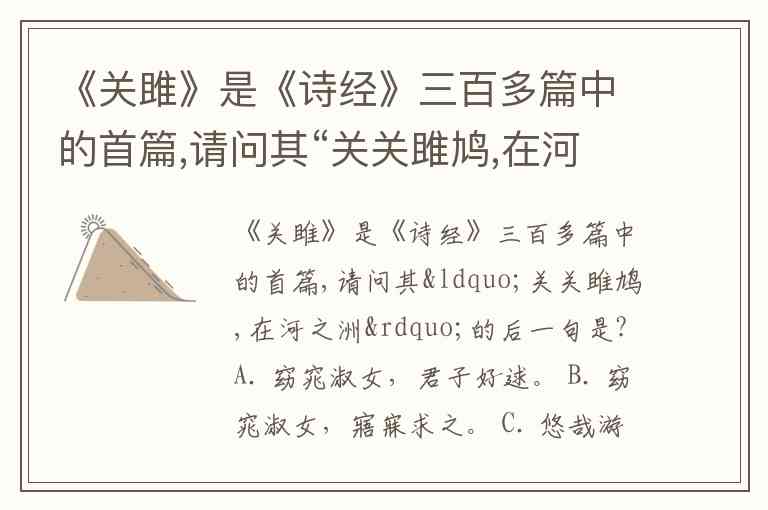 《关雎》是《诗经》三百多篇中的首篇,请问其“关关雎鸠,在河之洲”的后一句是? A. 窈窕淑女,君子好逑。 B. 窈窕淑女,寤寐求之。 C. 悠哉游哉,辗转反侧。 D. 窈窕淑女,琴瑟友之。