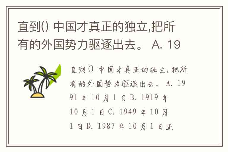 直到() 中国才真正的独立,把所有的外国势力驱逐出去。 A. 1991 年 10 月 1 日 B. 1919 年 10 月 1 日 C. 1949 年 10 月 1 日 D. 1987 年 10 月 1 日